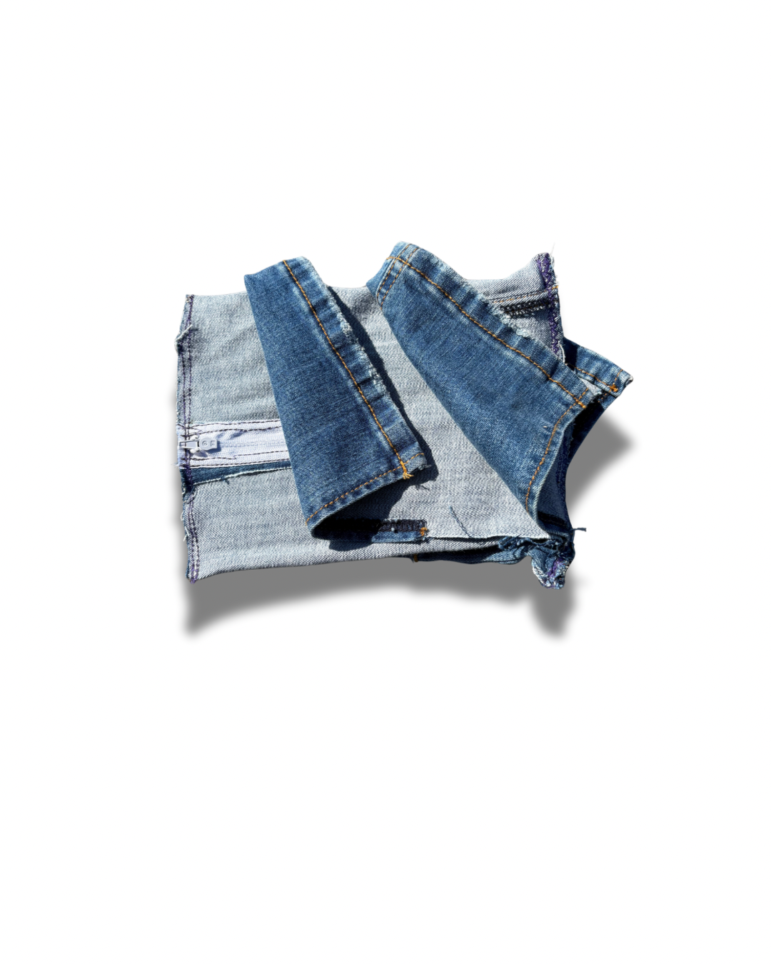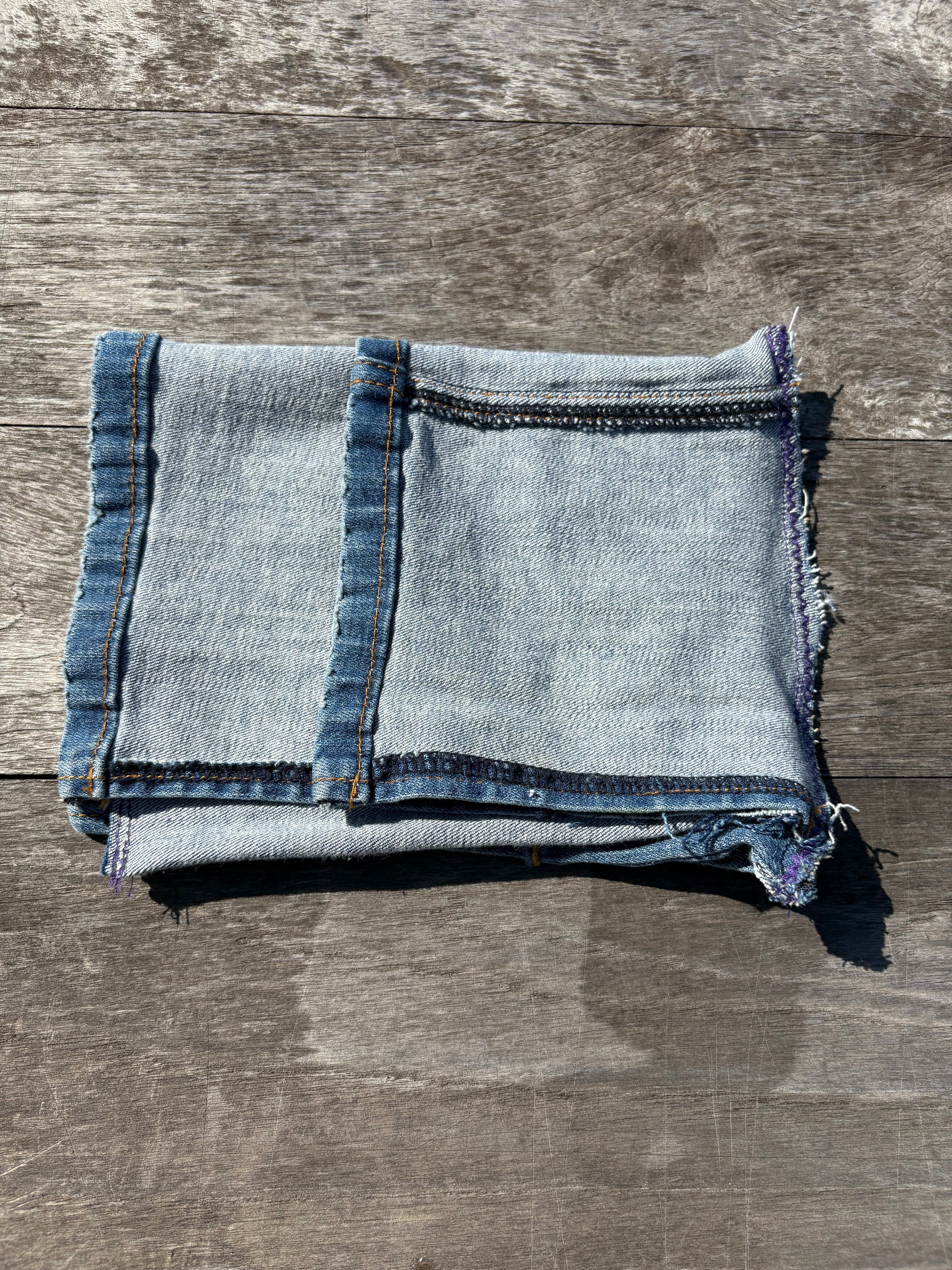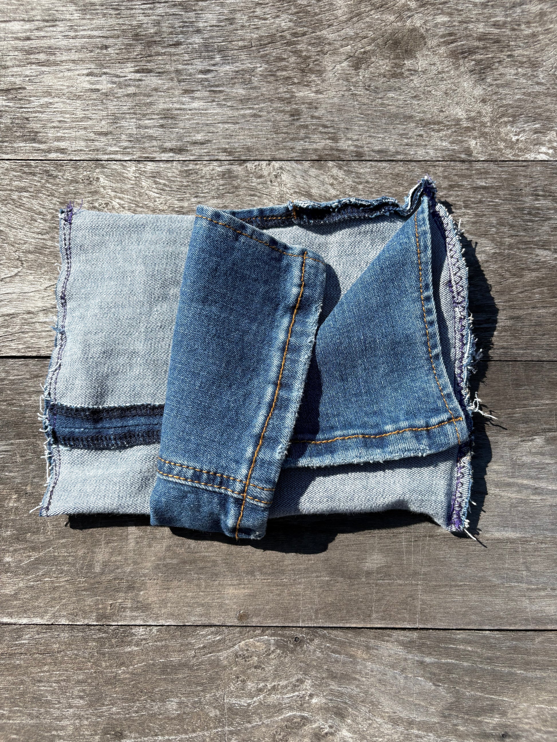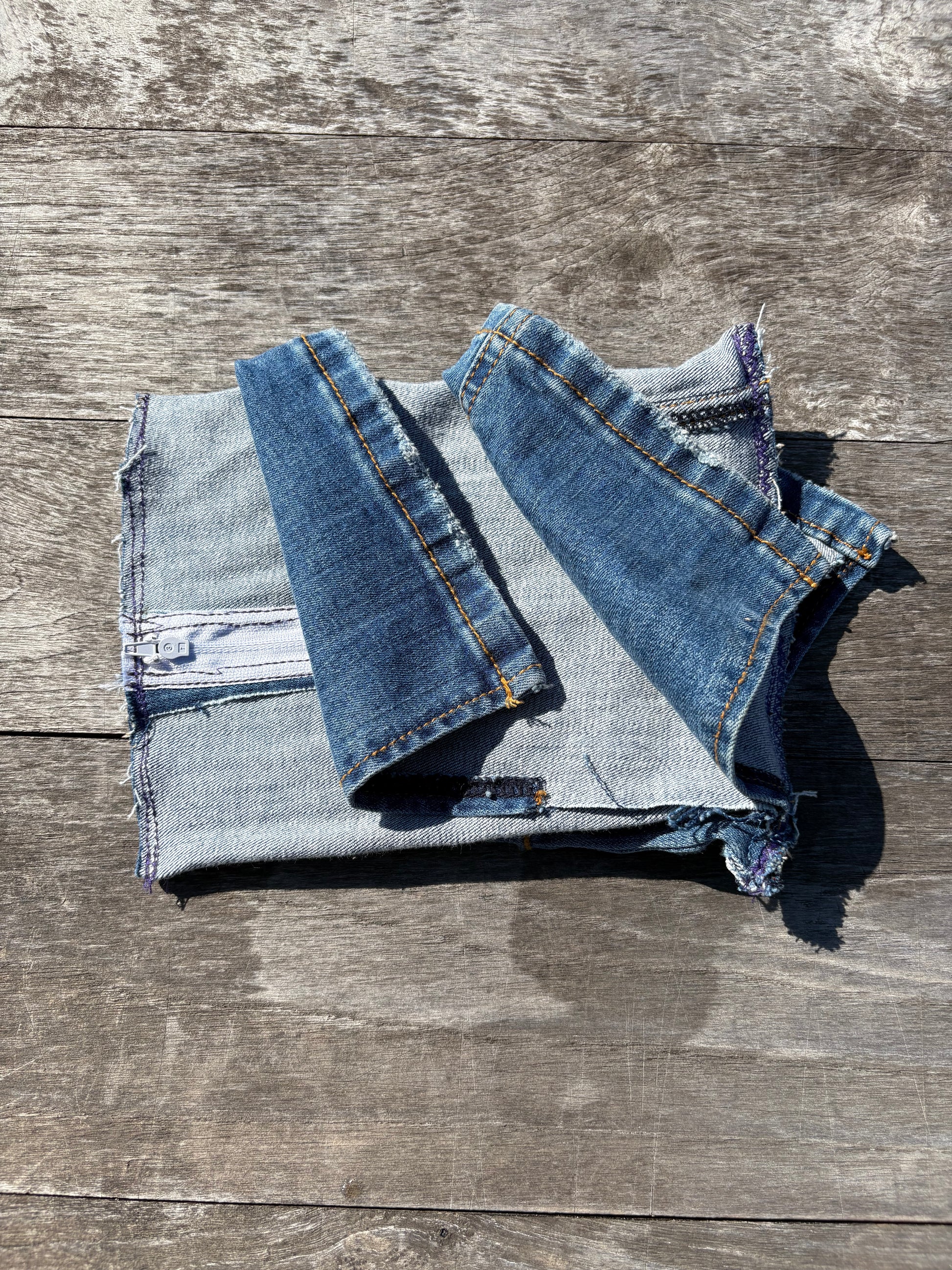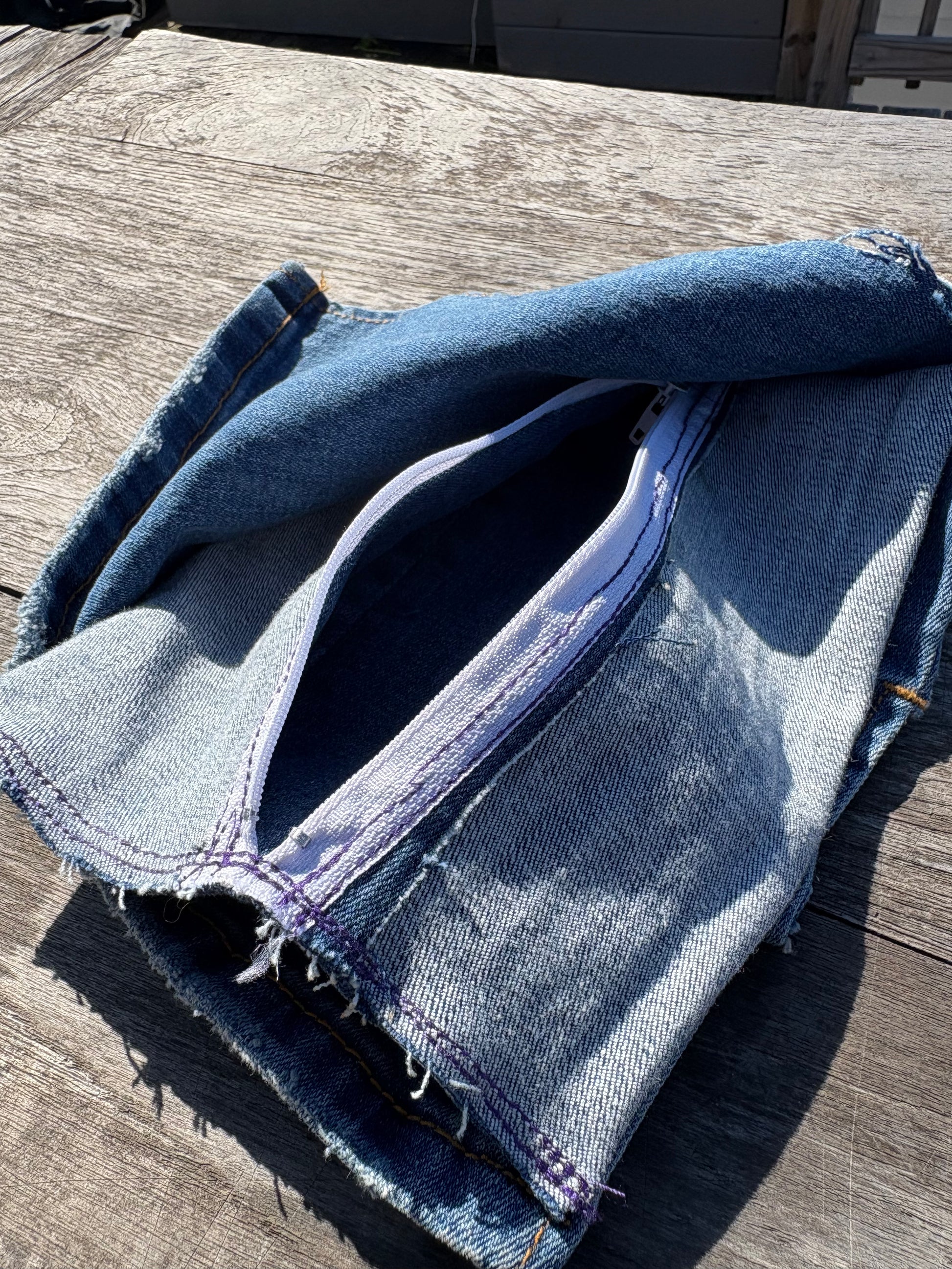 Repurposed denim exterior with visible inner seams and raw hems