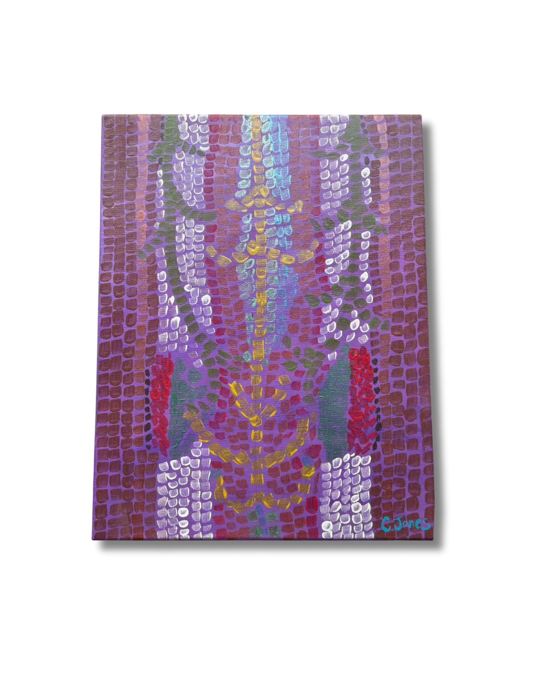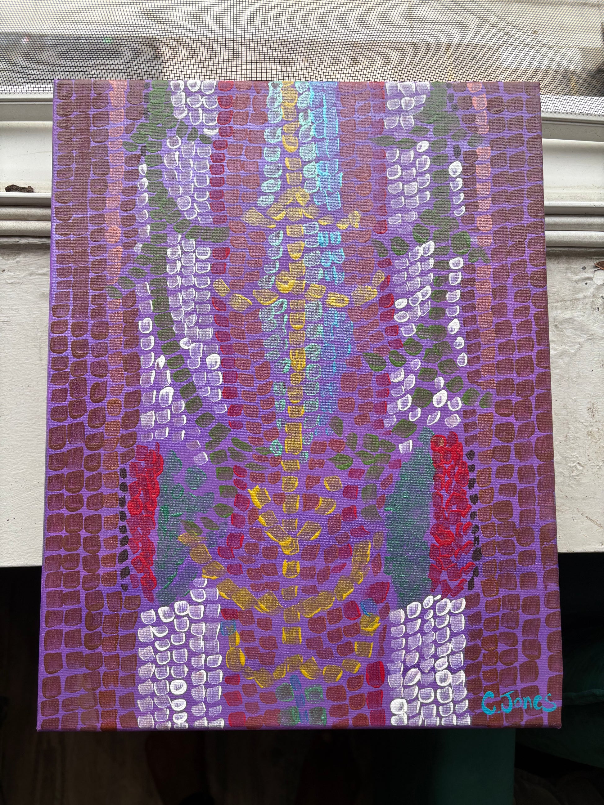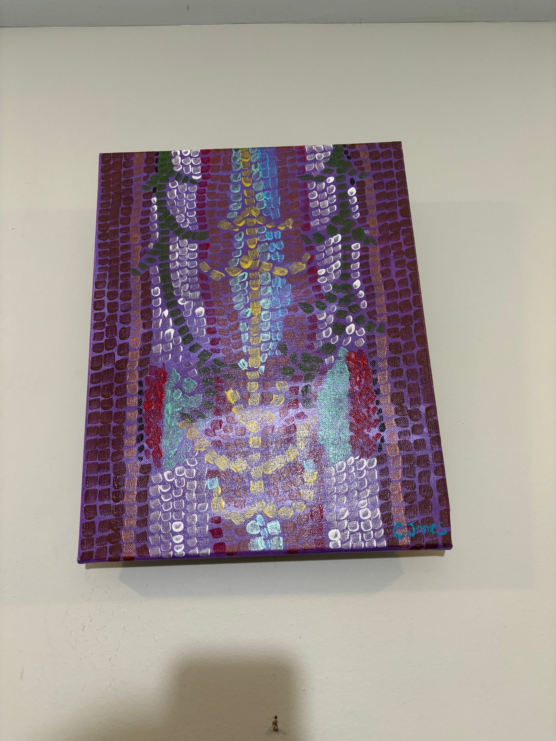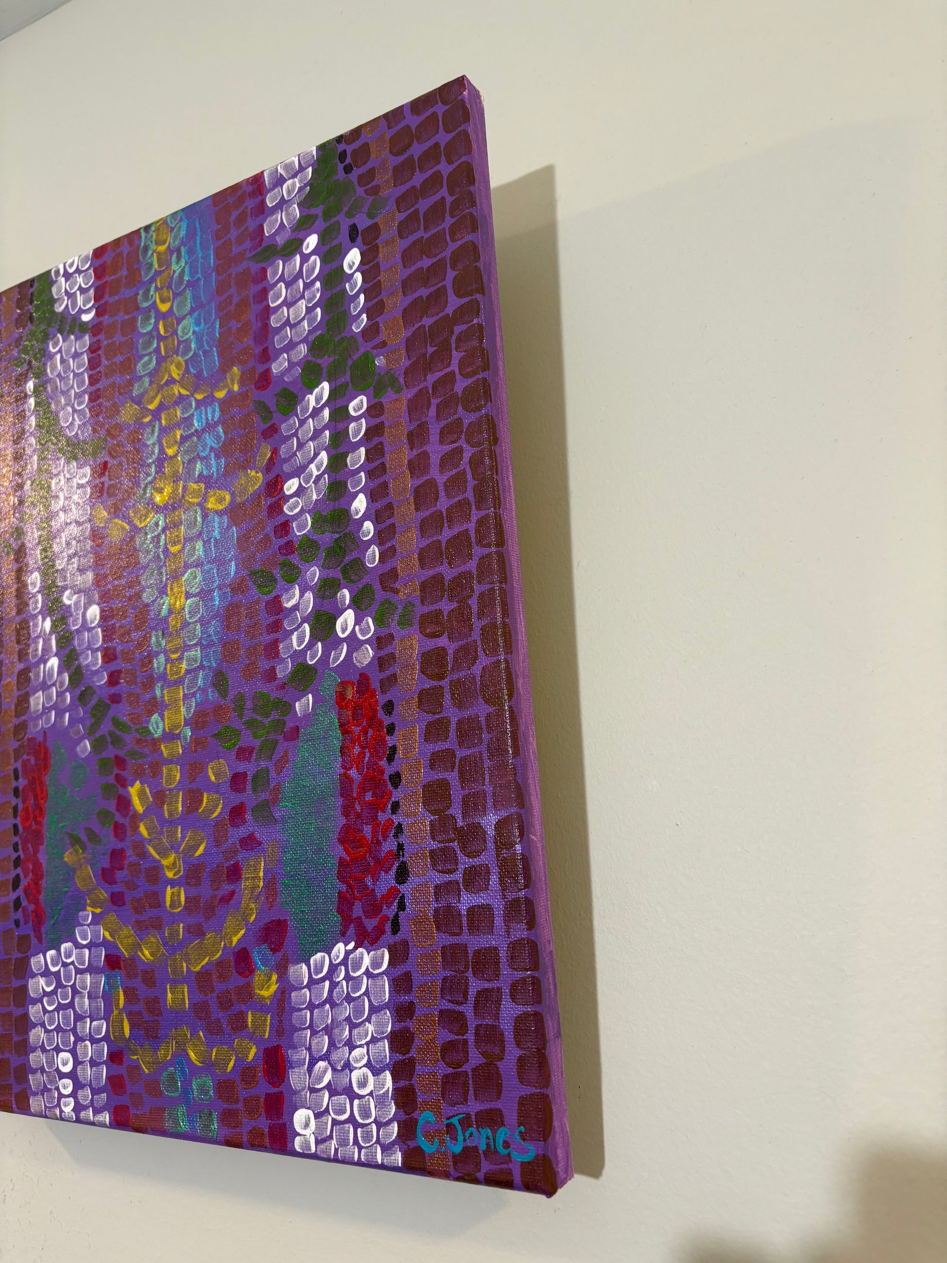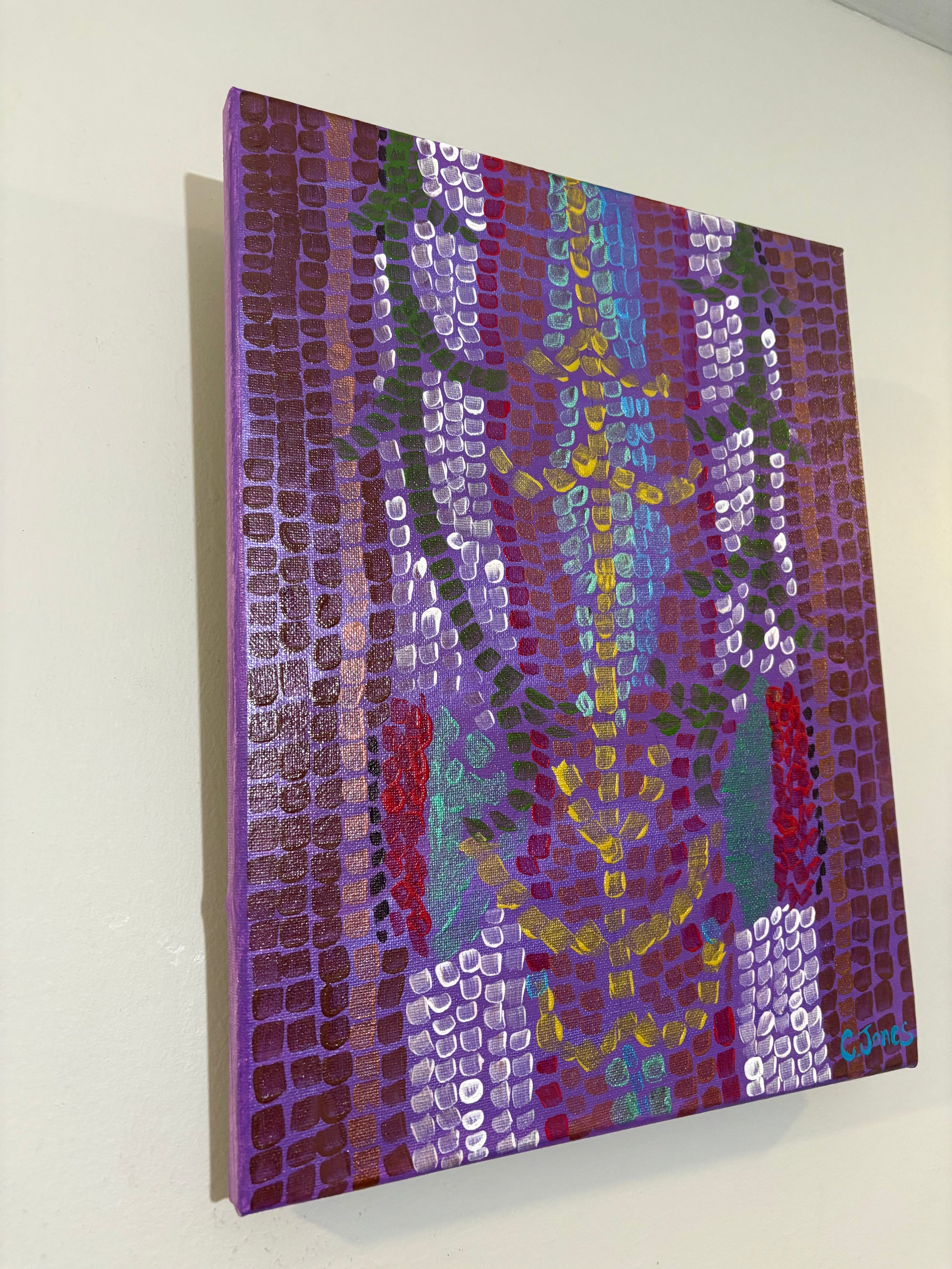 ‘Mosaic Roses’ showcases a striking piece of abstract art, painted with a distinctive style. The artwork features vibrant shades of purple, accented with bursts of yellow, red, and white, arranged in geometric patterns that evoke a sense of depth and movement. The use of square, grid-like brush strokes adds texture and a unique, almost mosaic-like effect to the piece. The central pattern, a mix of cool and warm colors, draws the eye, while the rich tones of purple create a harmonious, balanced background.