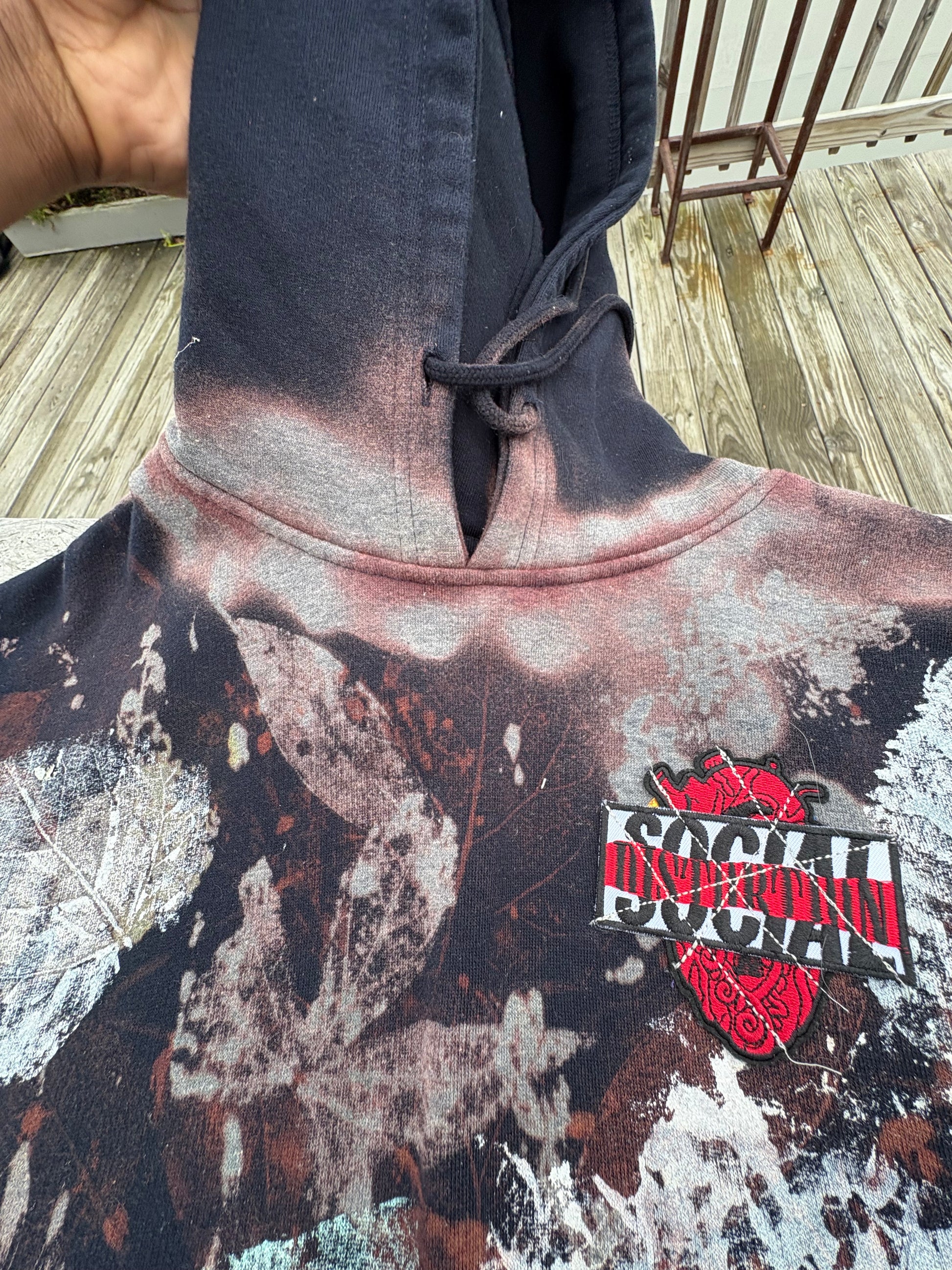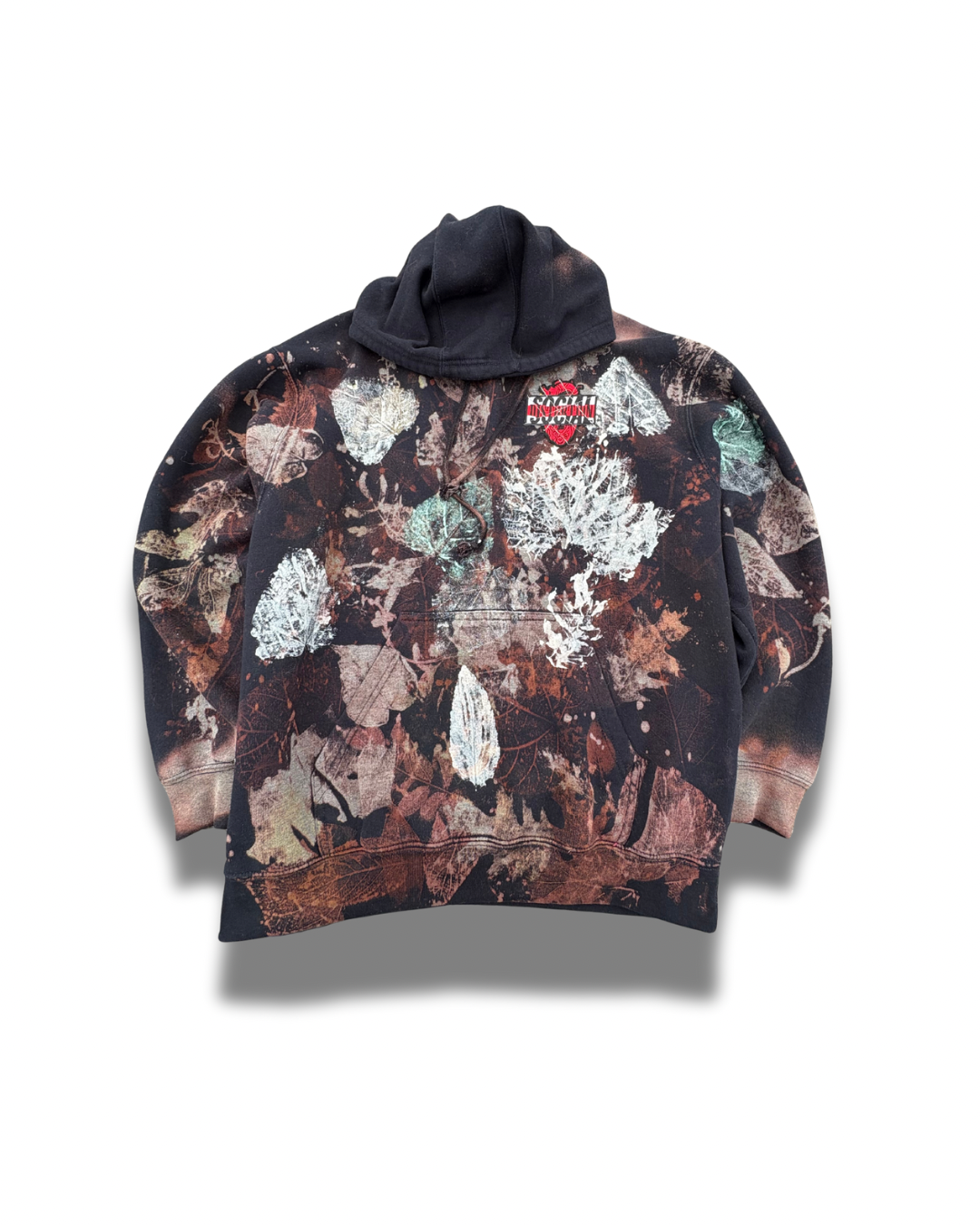 The black base is aggressively bleached and overdyed, forming a moody gradient from charcoal to rust. Layered prints in white, copper, and muted teal recreate the ghostly outlines of leaves, bringing out each vein and contour with haunting clarity. Pair it with black cargos or raw denim and combat boots for a post-apocalyptic streetwear vibe. Or go nature-core with earth-toned pants and layered textures. Either way, the Social Distortion Hoodie is the kind of piece that doesn’t just match your fit — it defines it.