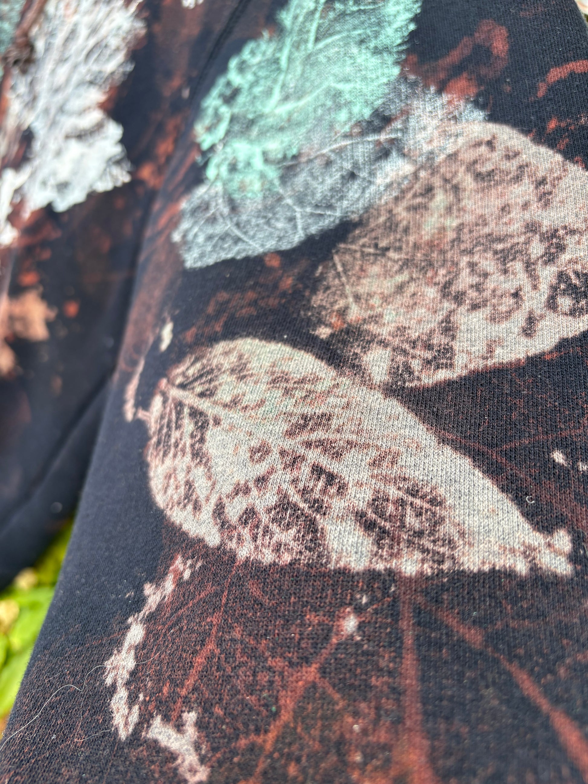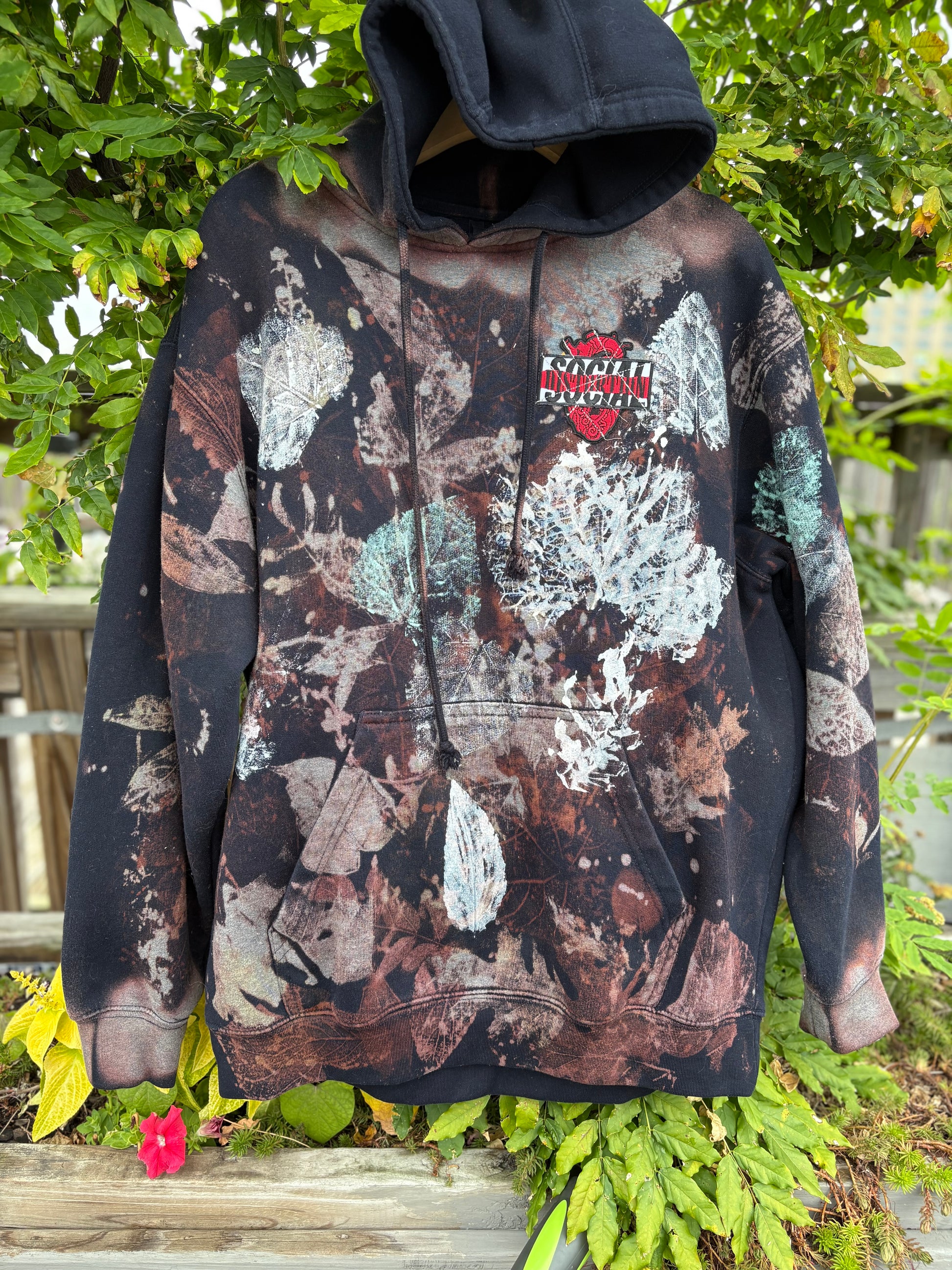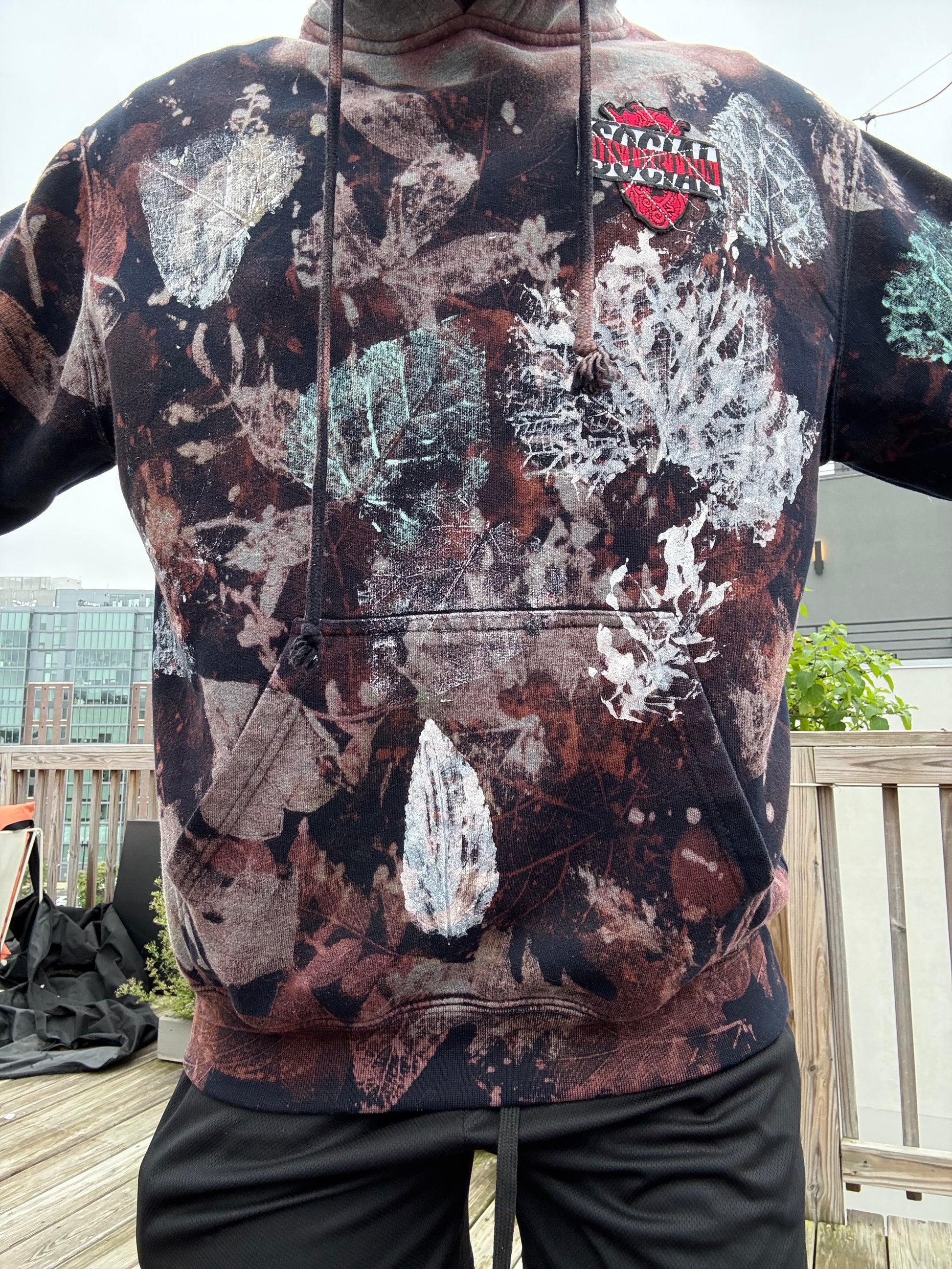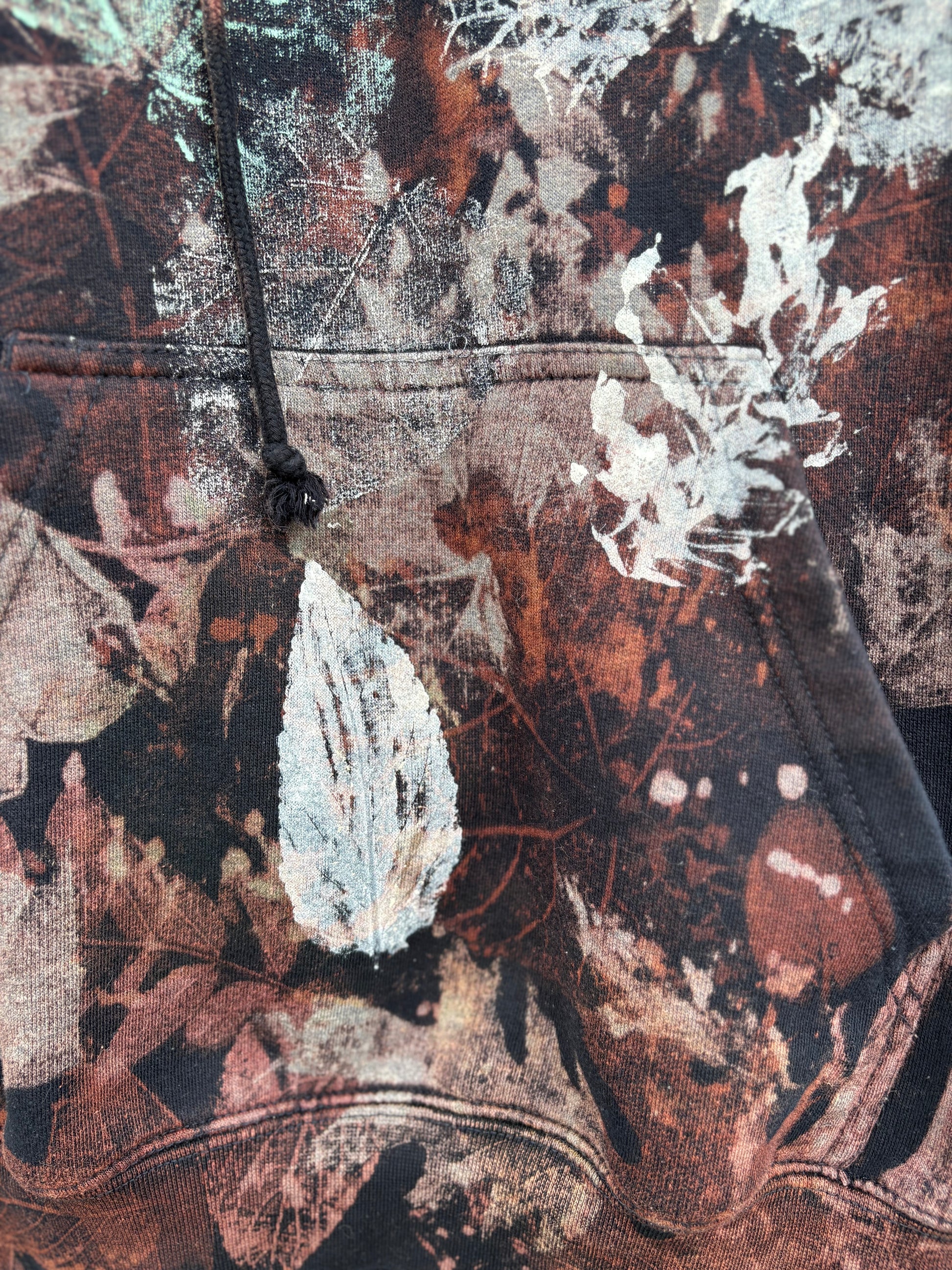 Design: Bleach-dyed and leaf-printed by hand; no two hoodies are exactly alike