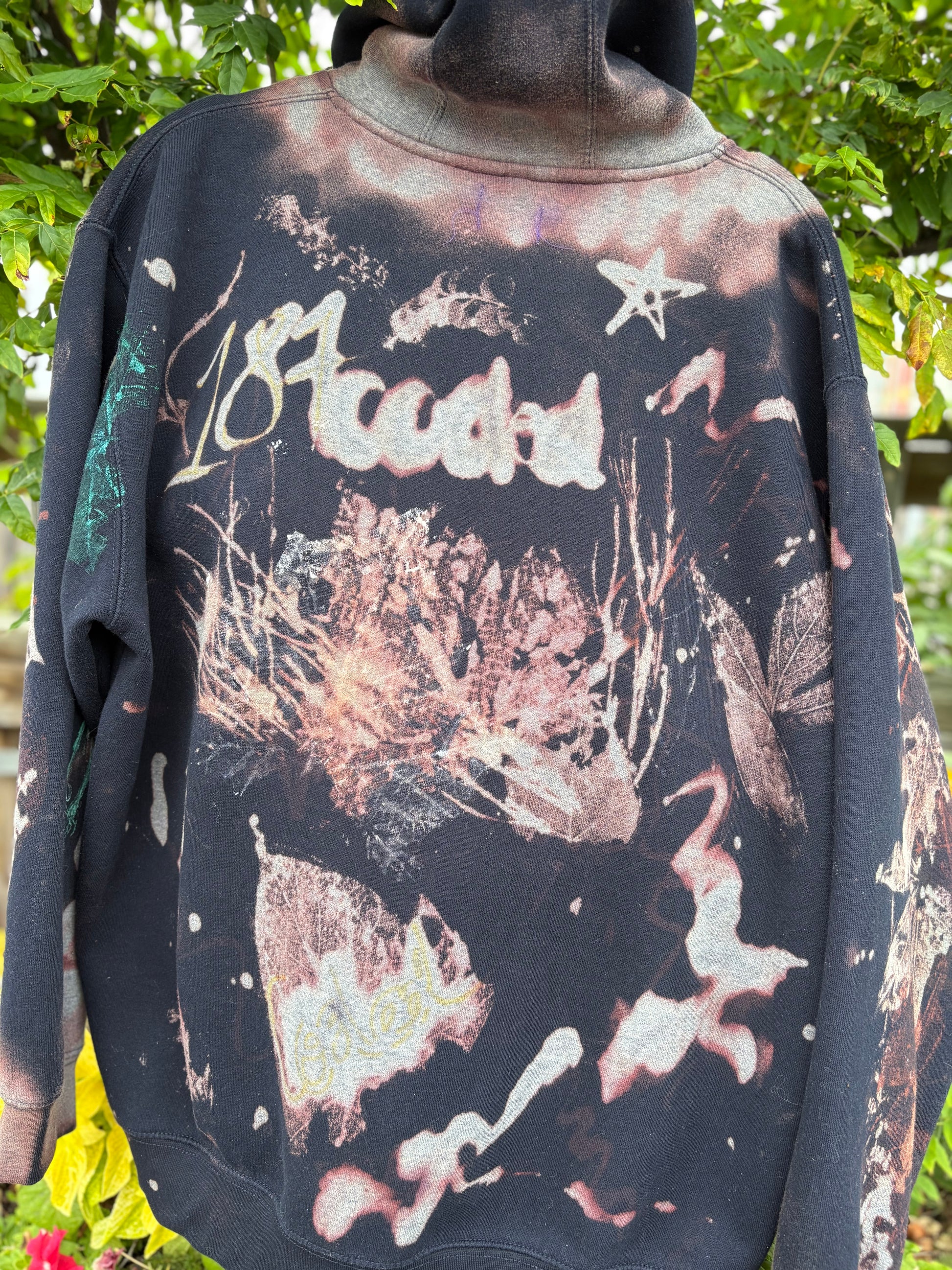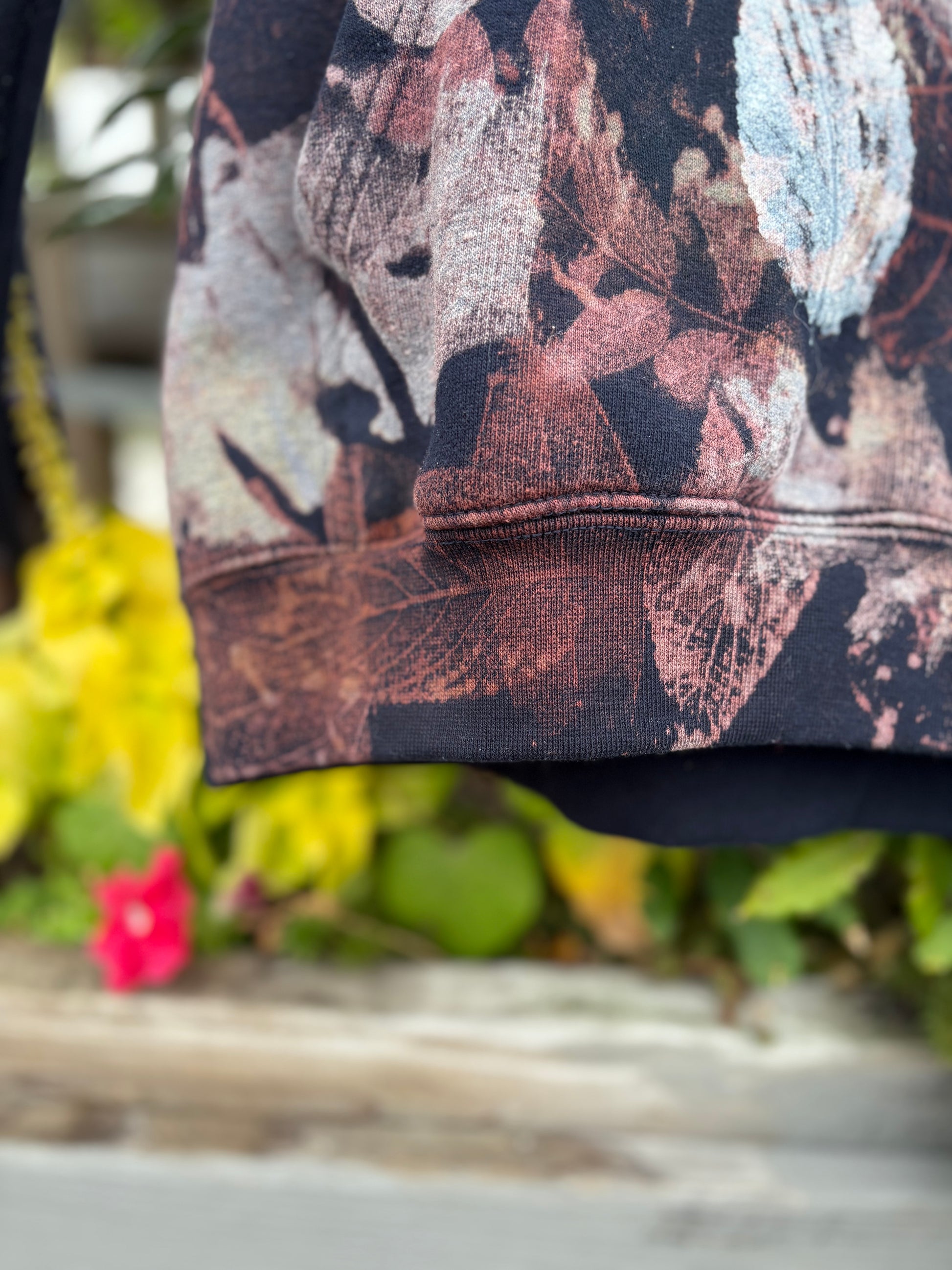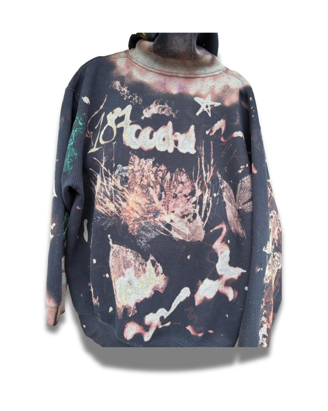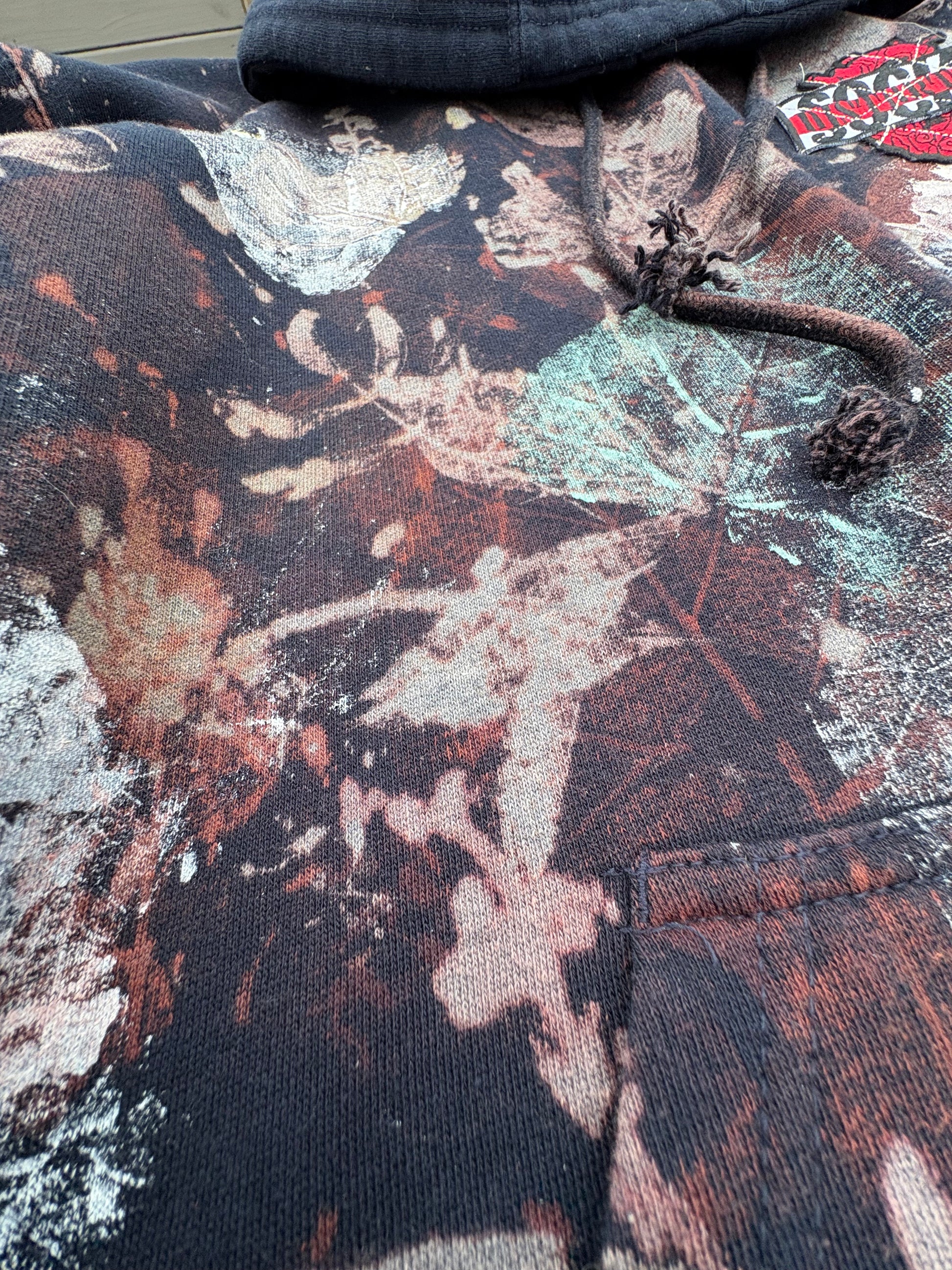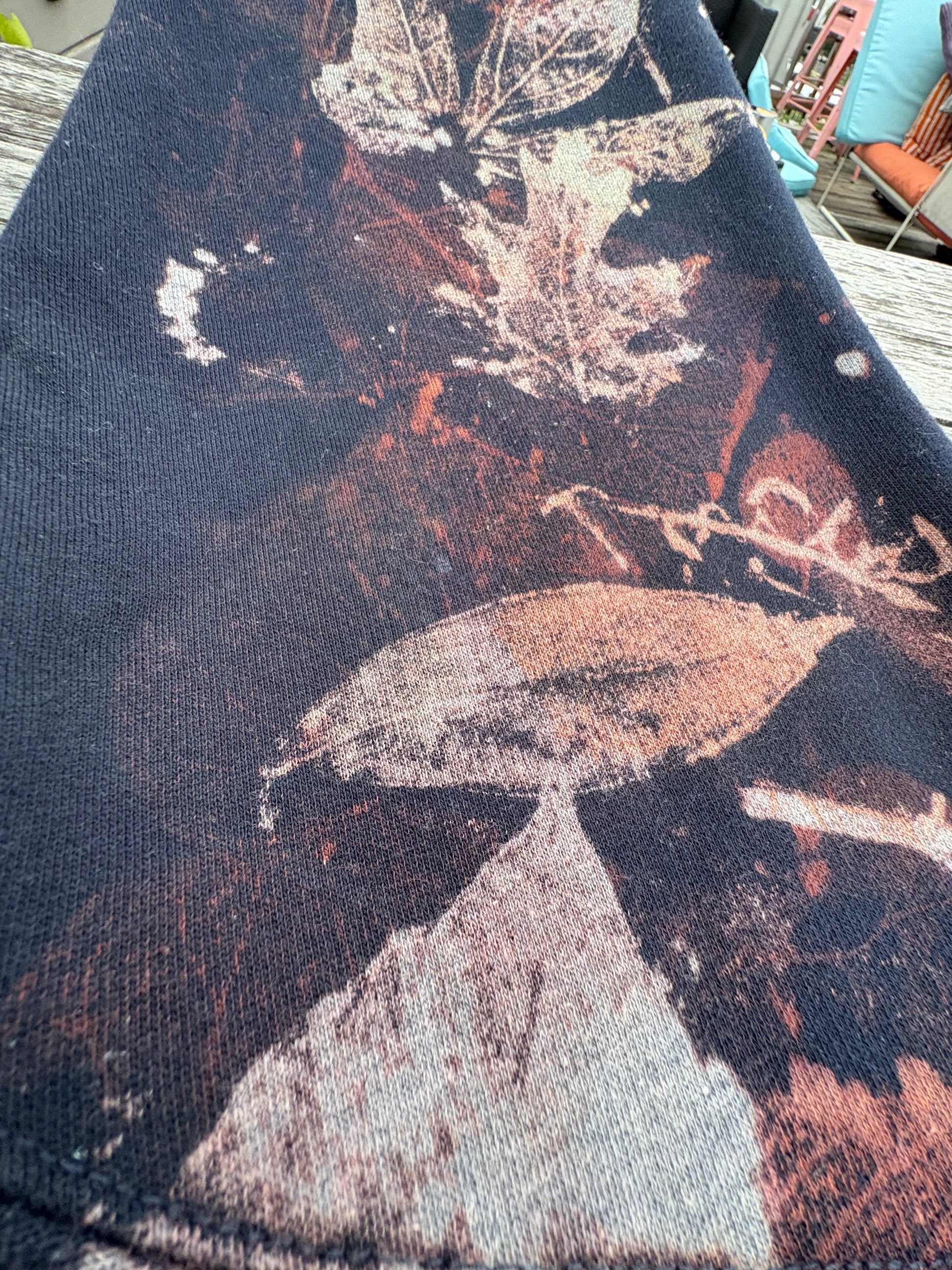 Design: Bleach-dyed and leaf-printed by hand; no two hoodies are exactly alike