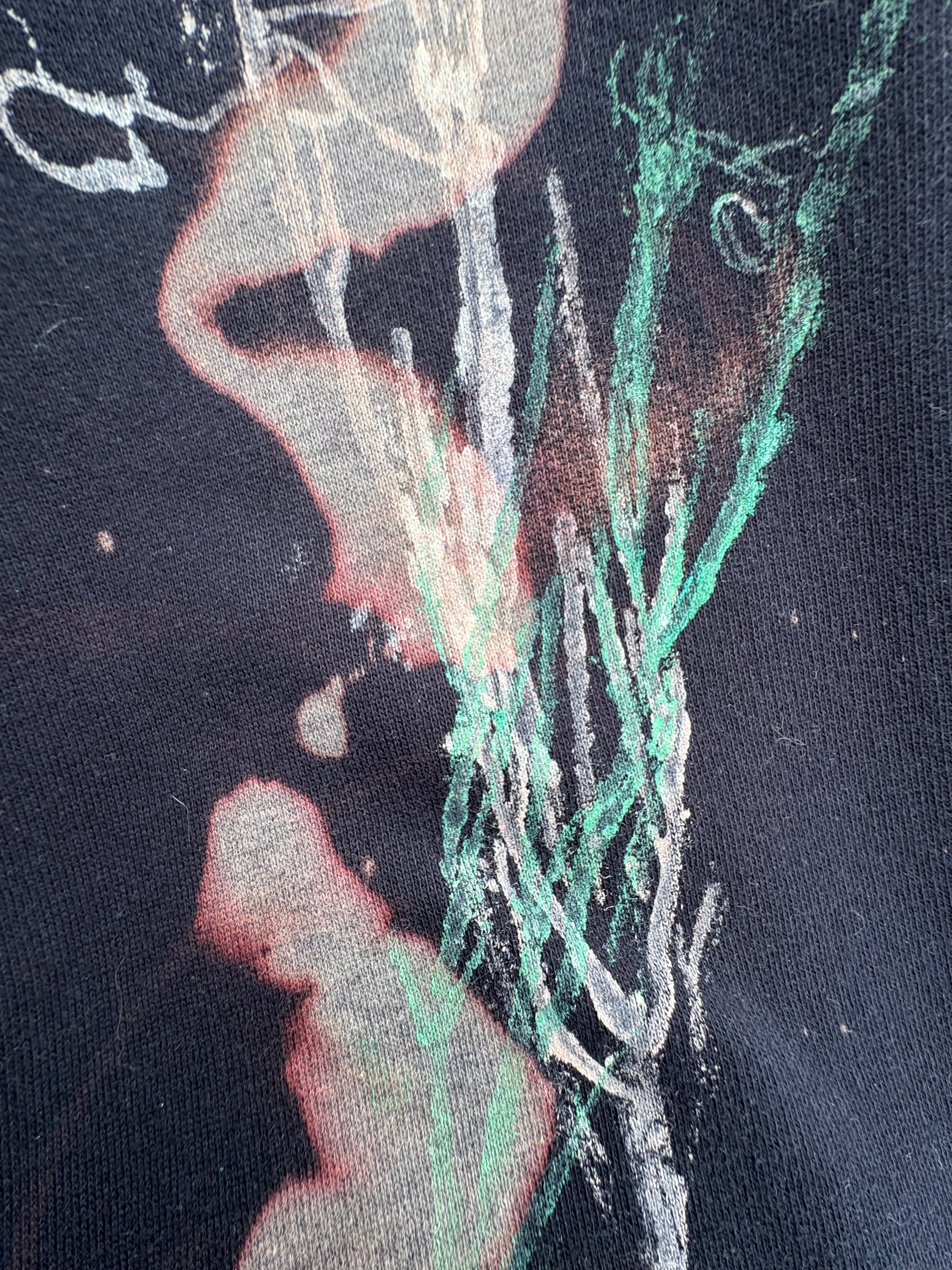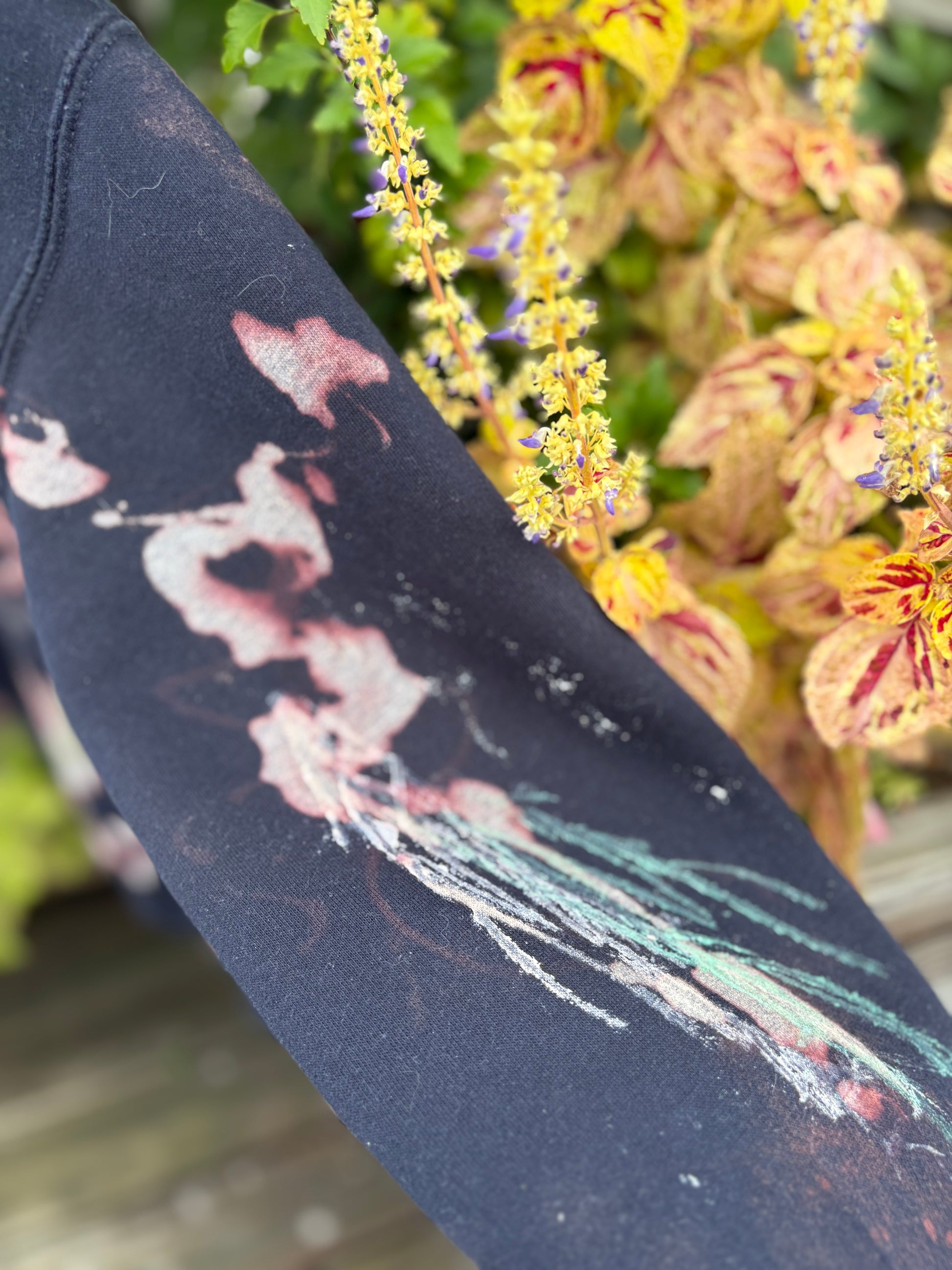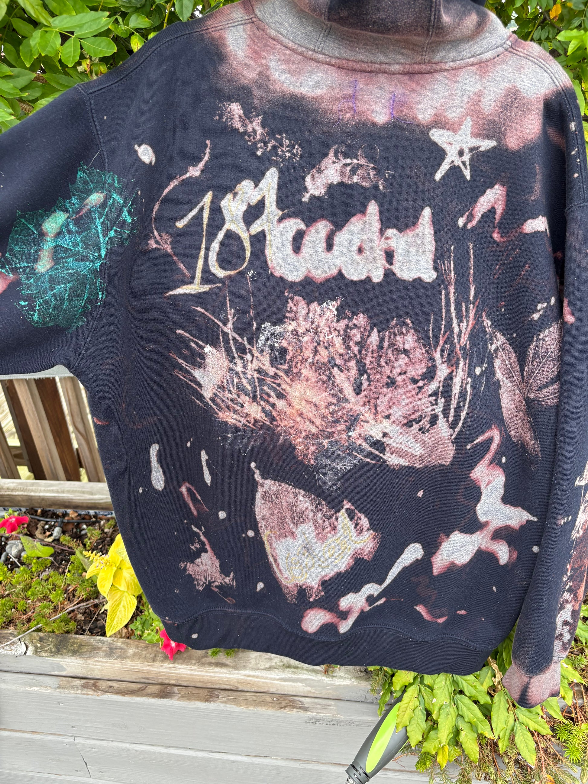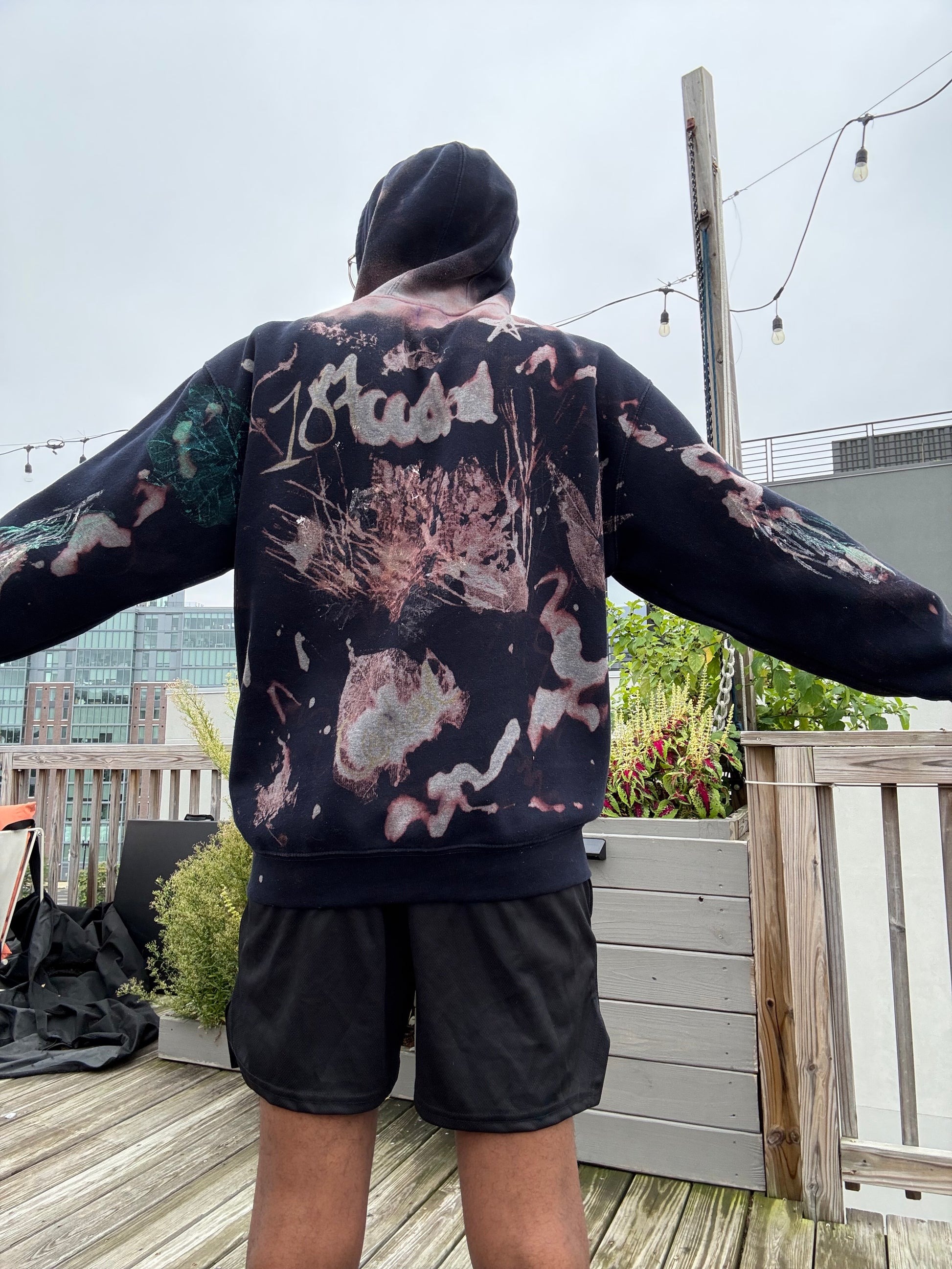 Design: Bleach-dyed and leaf-printed by hand; no two hoodies are exactly alike